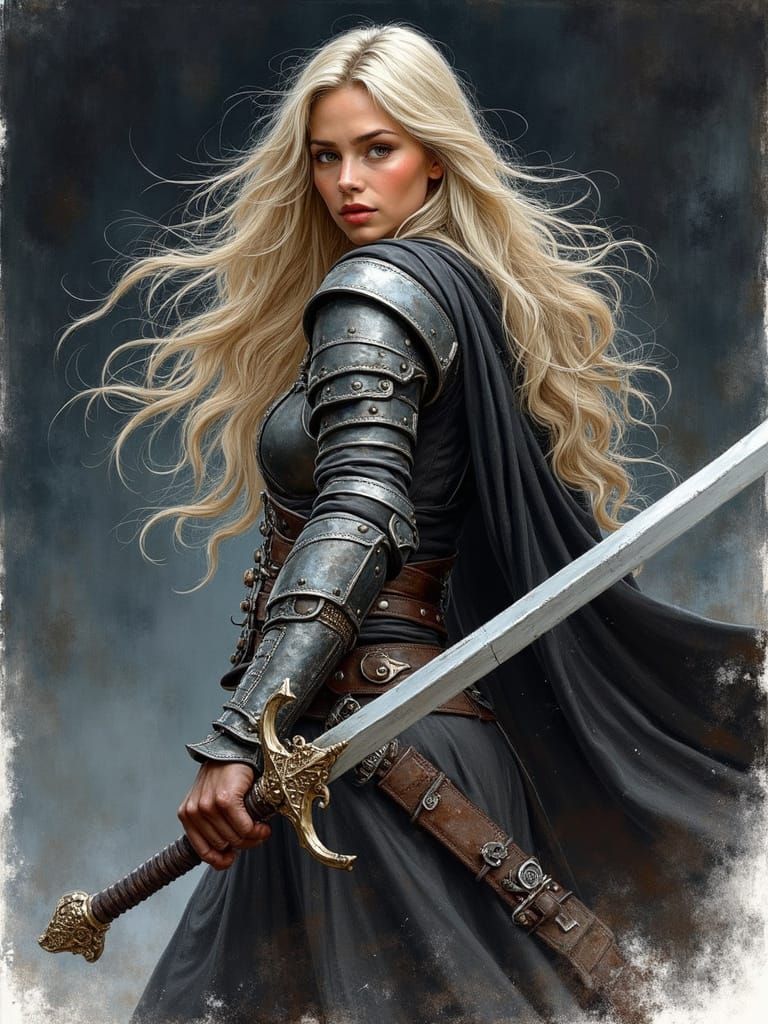 This image depicts a proud warrior with flowing hair and a majestic two-handed sword, set against a dark night backdrop. The illustration features intricate details and a symmetrical, beautiful face, reminiscent of classic fantasy art styles.