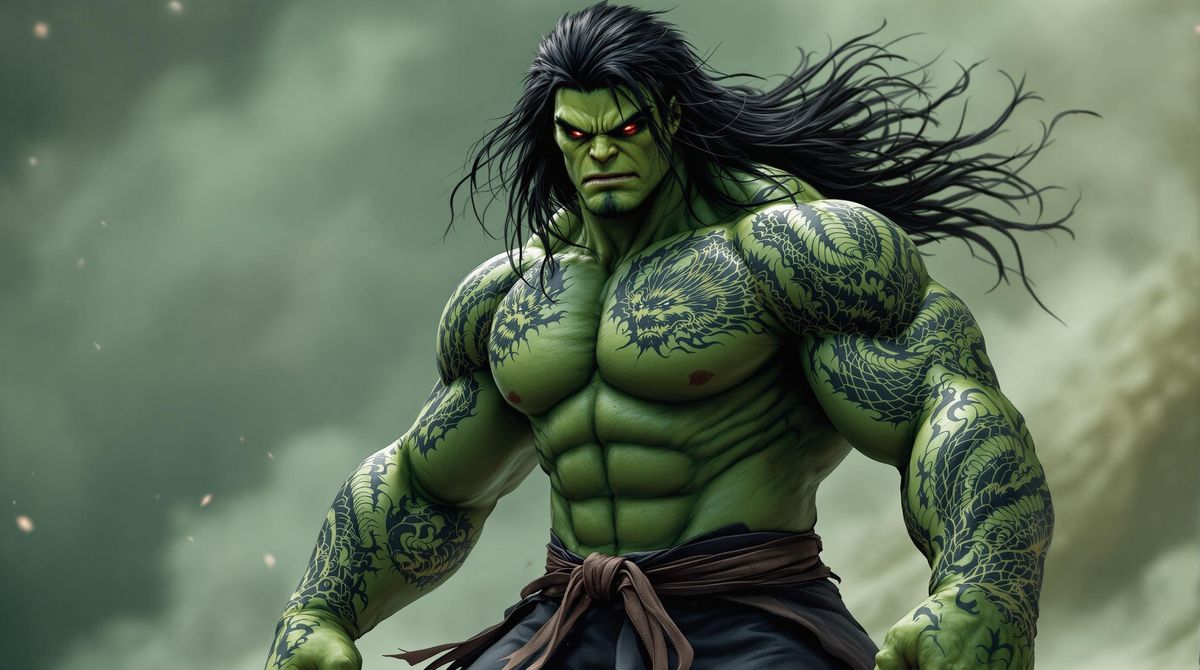 This image shows a muscular Japanese man with long black hair and dragon tattoos, dressed as a ninja. The realistic, full-body depiction features cinematic lighting and detailed textures, inspired by Japanese art styles.