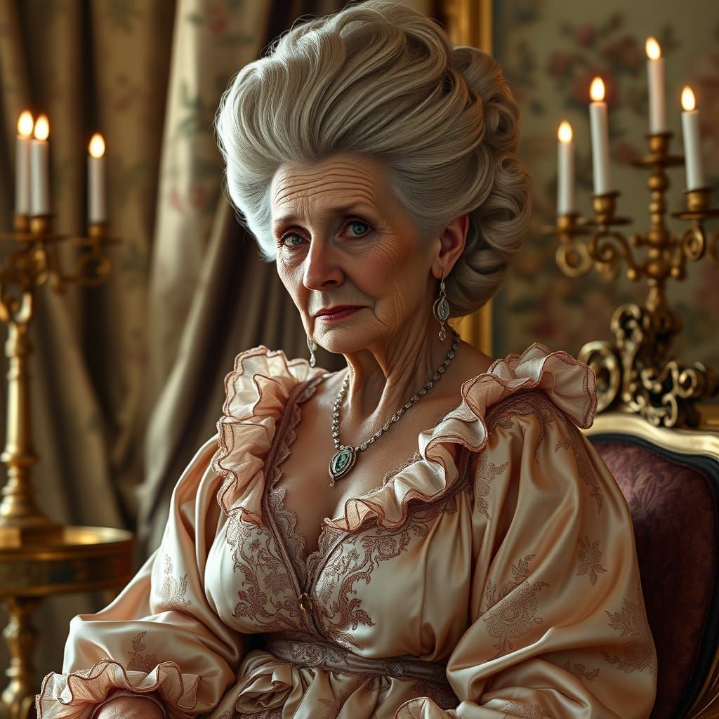 This image depicts an elderly courtesan in a lavish, silk nightgown, surrounded by opulent furnishings and soft candlelight, evoking a sense of nostalgia and refinement, reminiscent of 18th-century French art and fantasy concept art.