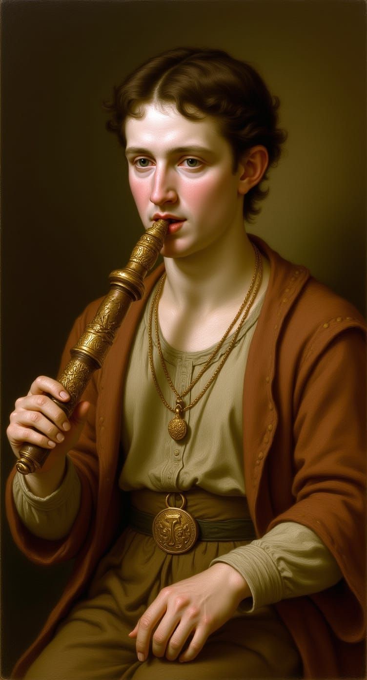 This image shows David in Renaissance clothing playing a flute. The artwork features dramatic lighting and intense emotion, capturing the essence of Renaissance sculpture.