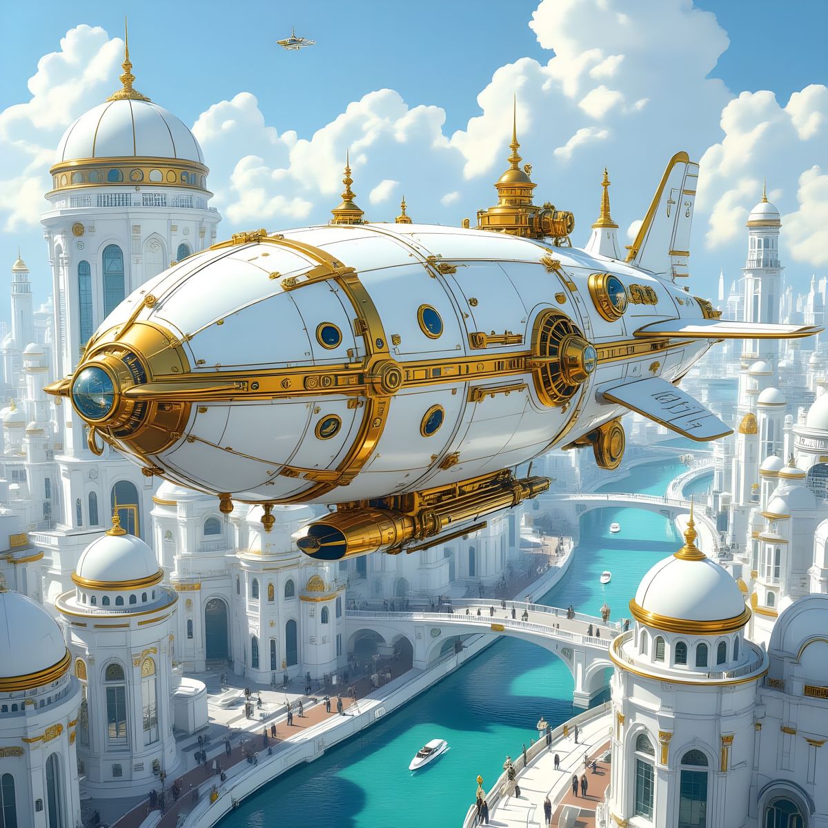 A majestic white steampunk airship floats above a futuristic city with canals and golden architecture. This scene captures a blend of advanced machinery and elegant design, rendered in a refined steampunk aesthetic.