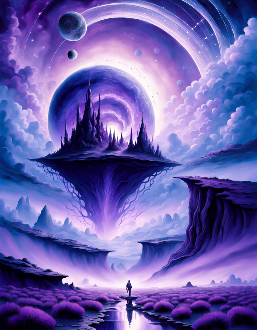 This surreal digital painting depicts a giant catapult launching a small Earth into a swirling cosmic sky. The artwork features an ethereal glow, subtle textures, and a dark, moody atmosphere with deep blues and purples, evoking a sense of vastness and mystery.