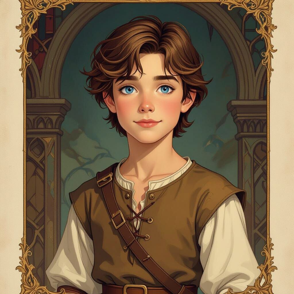 This image features a 13-year-old boy, depicted as a book character with neat brown hair and blue eyes. Rendered in a classic fantasy illustration style, it evokes a sense of adventure and whimsy with soft lighting and earthy tones.