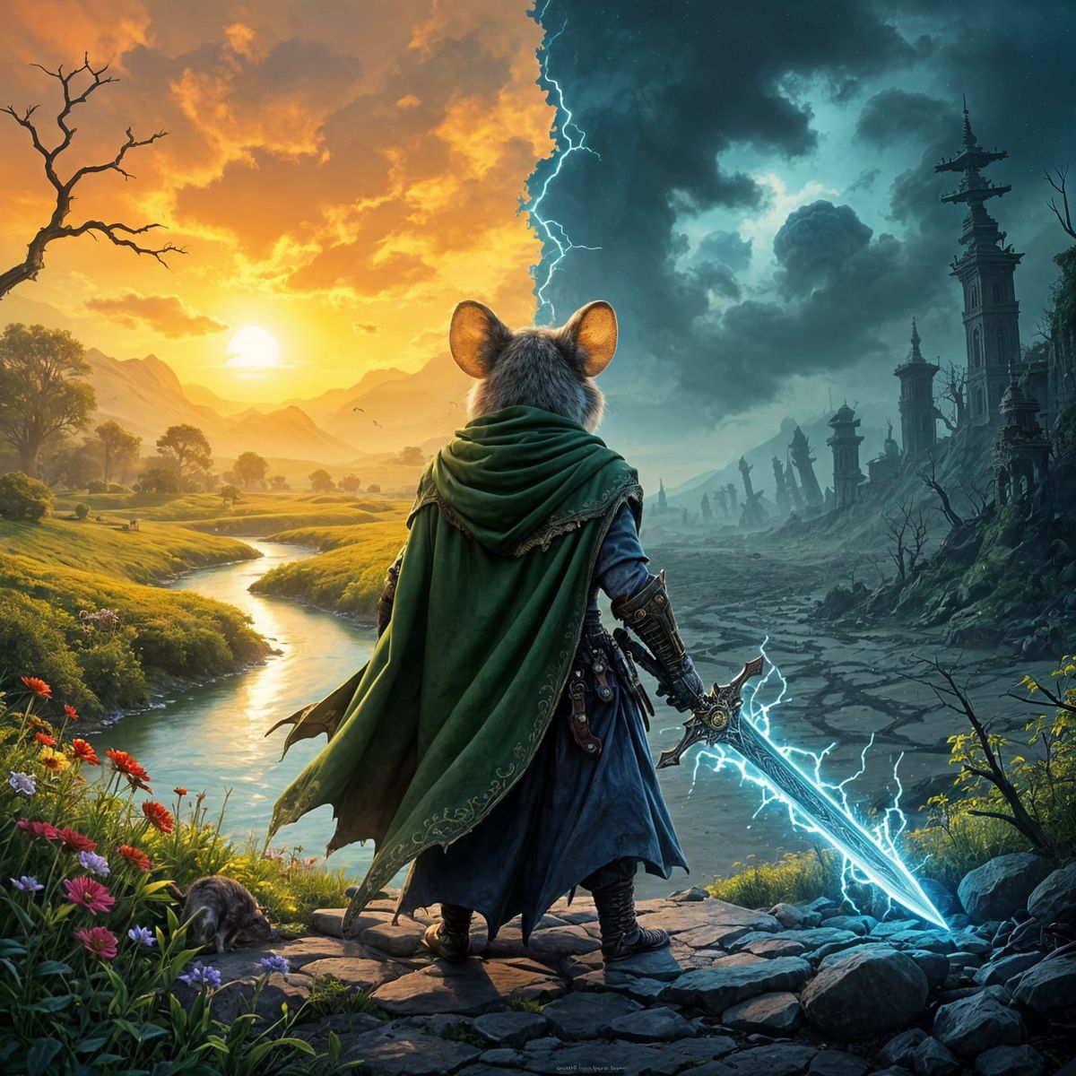 This image shows Finn, the mouse wanderer, standing between a vivid realm of life and a desolate land of death. The cinematic image is rich in symbolism and evokes an ethereal fantasy, reminiscent of Thomas Kinkade's style.