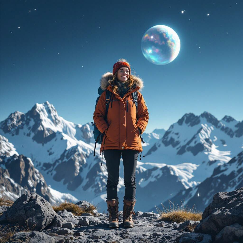 A hyperrealistic image of a smiling woman on a rocky mountain, wearing hiking gear. A bubble floats above her in this digital artwork with soft lighting and deep shadows.