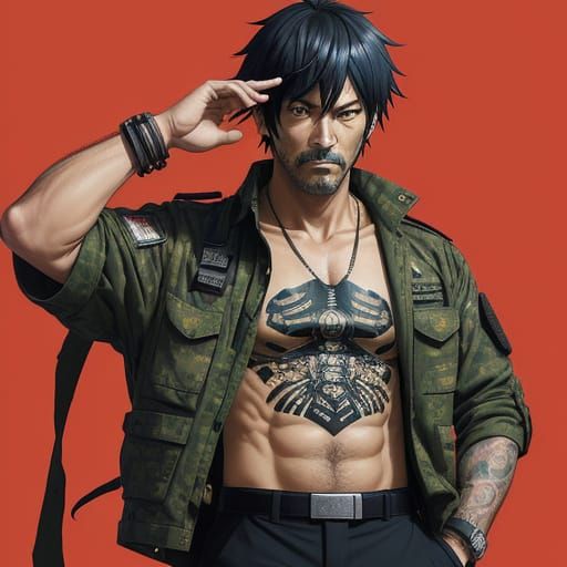 A digital artwork of a stout, balding Italian man in tactical gear and a Hawaiian shirt. The anime-style illustration features bold lines, vibrant colors, and meticulous details, blending rugged realism with tropical playfulness.