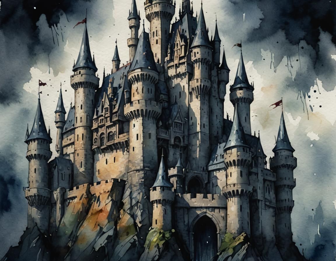 A striking picture of a dark and ominous castle rendered with watercolor textures. The image emphasizes depth and a sinister atmosphere, as interpreted by an AI.