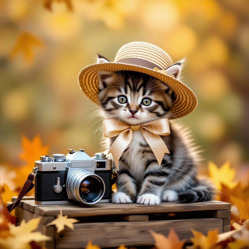A charming, tiny kitten in a straw hat sits with a vintage camera amidst soft, bokeh-lit autumn leaves. This image evokes a storybook fantasy style with delicate airbrush art details.
