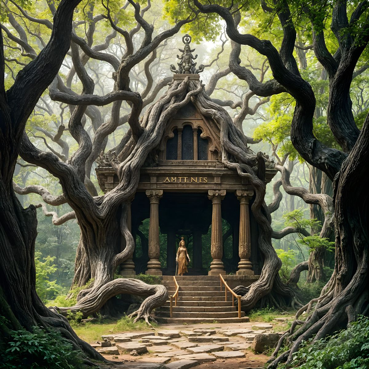 A majestic temple formed from ancient trees, nestled in a vibrant forest. The image showcases intricate, organic details and soft, ethereal lighting, with a painterly, slightly surreal aesthetic.
