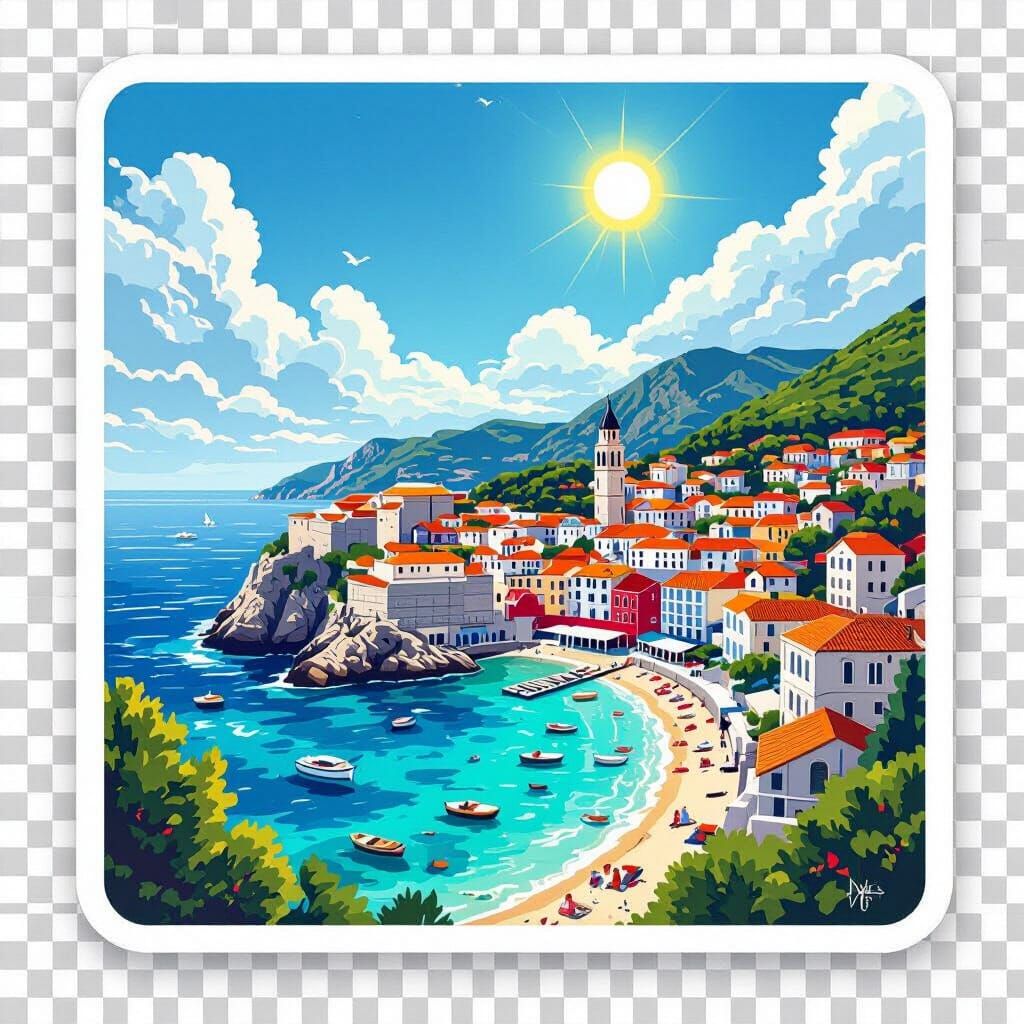 This image features a minimalist die-cut sticker illustration of Croatia's Adriatic coast, showcasing turquoise waters, seaside homes, and Dubrovnik's red roofs. Rendered in a detailed matte painting style with rich colors.