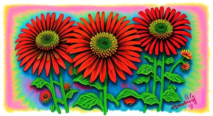 Rusty Robot Colorful Zinnias Flowing Pastel Colors Zentangle Oil Gouache Josphine Wall