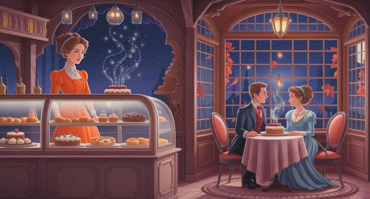This image shows a 3D fantasy illustration of a Victorian woman in a pumpkin-colored dress standing behind a glass bakery case, serving a Victorian couple in a cozy, magical cafe with warm lighting.