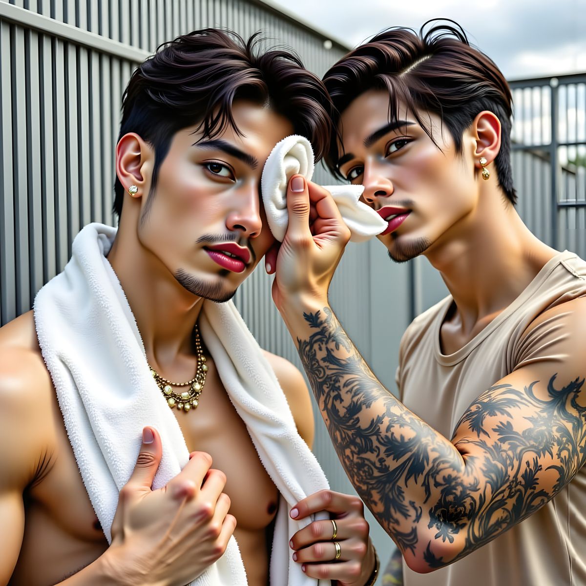 This image shows two attractive Asian men close together against a background of metal bars. One man has his eyes closed and a towel around his neck while the other dabs his forehead. The scene is softly lit.
