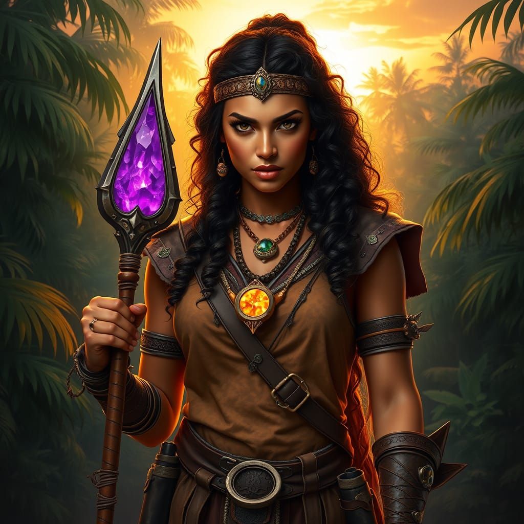 A striking image of a strong and confident warrior woman standing in a lush jungle at sunset, surrounded by golden light and mystical energy