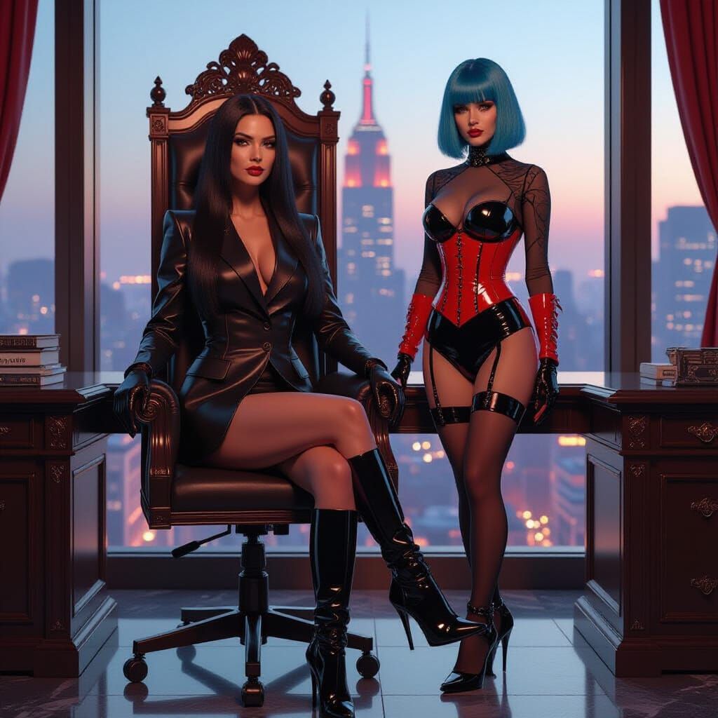 A striking picture of a woman on a throne in a cyberpunk office. A figure in a mesh bodysuit stands nearby. This image balances moody elegance and strict authority in a cyberpunk aesthetic.