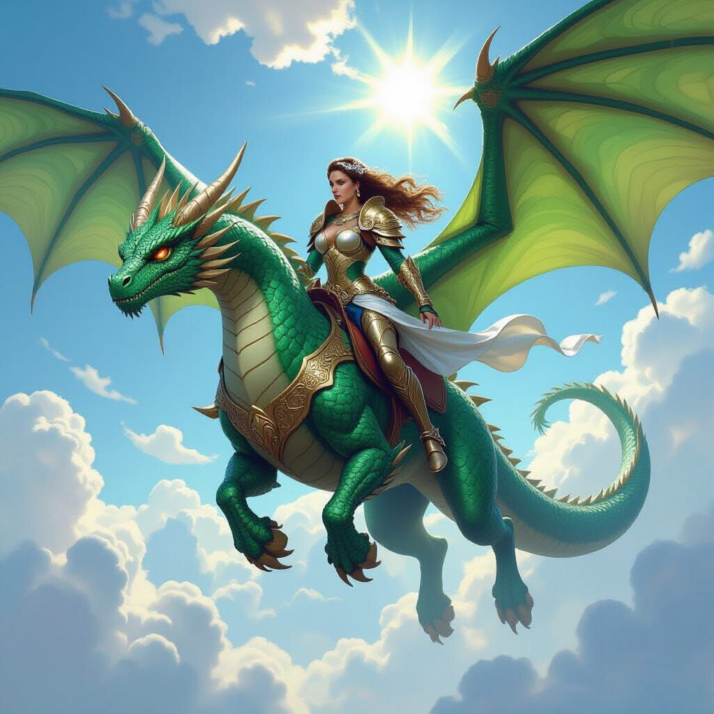 A formidable warrior princess mounts her colossal emerald dragon, soaring into a breathtaking sky with iridescent clouds. Rendered in an epic, painterly fantasy style with dynamic lighting and vivid colors.