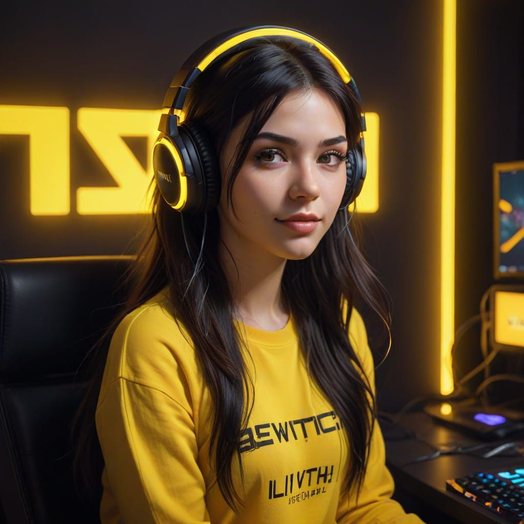 This image shows a young woman with dark hair and headphones live-streaming on Twitch. The digital art features a vibrant pixel art style, soft pastel overlays, and warm golden lighting.