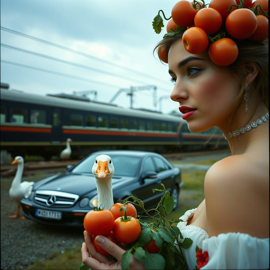 This image depicts a surreal and cinematic scene with a woman, tomatoes, a train, geese, and a Mercedes-Benz. The artwork features film grain, vignette, and dramatic, cinematic lighting.