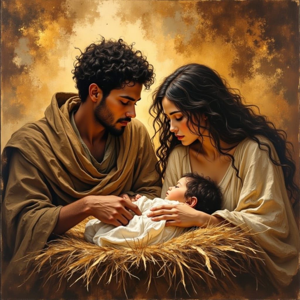 This image shows a hyperrealistic oil painting of a family in an ancient manger, bathed in warm, golden light. Detailed textures evoke peace and divine presence, inspired by classic masters.