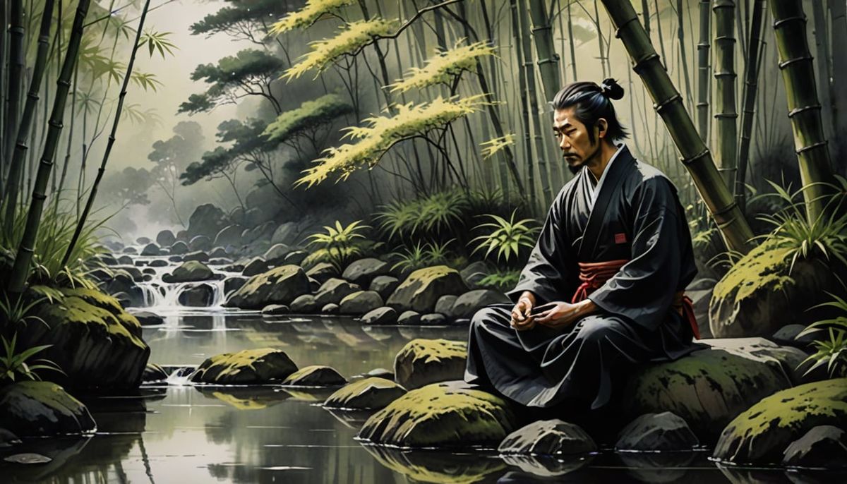 This image shows a samurai meditating in a bamboo forest. The artwork uses delicate ink brush strokes and light watercolor washes to create a serene and contemplative atmosphere, reminiscent of classical East Asian art.