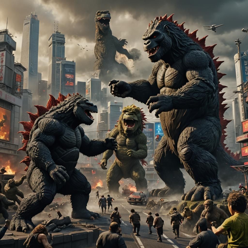 This image shows Muppet versions of Godzilla and King Kong battling in Tokyo. This detailed matte painting features deep, complementary colors and intricate details, rendered as fantasy concept art in 8k resolution.