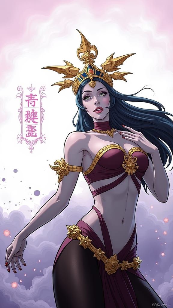 This image depicts a powerful queen Medusa battling through the heavens in a stunning, cinematic scene. Created in a vibrant, cel-shaded style reminiscent of Studio Trigger's animated masterpieces.