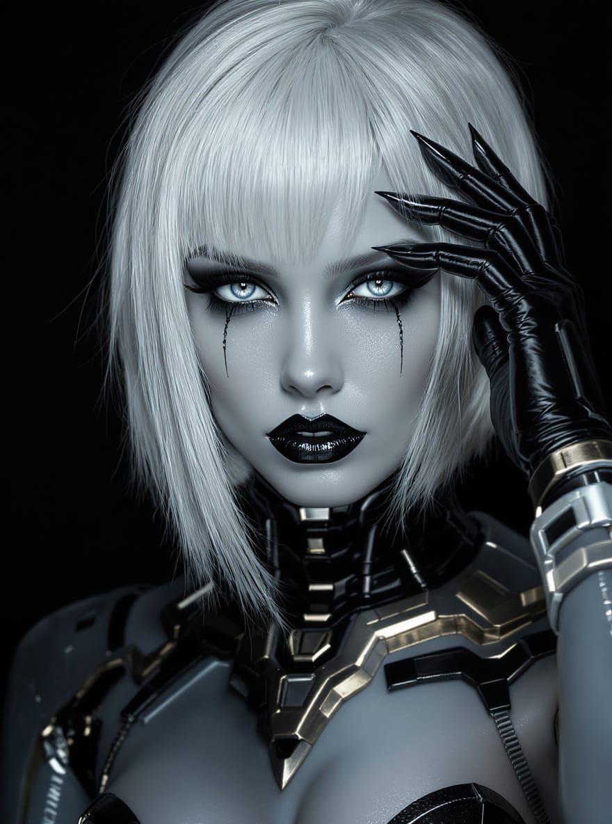 This image shows a beautiful woman with striking silver hair and bold makeup. She wears a hyperdetailed bodysuit with biomechanical patterns in a cyberpunk aesthetic. The portrait features dramatic lighting and high contrast.