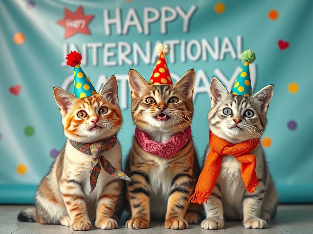 This image shows adorable cats wearing party attire, celebrating International Cat Day. The photorealistic style captures precise details and textures, creating a heartwarming and joyful scene.