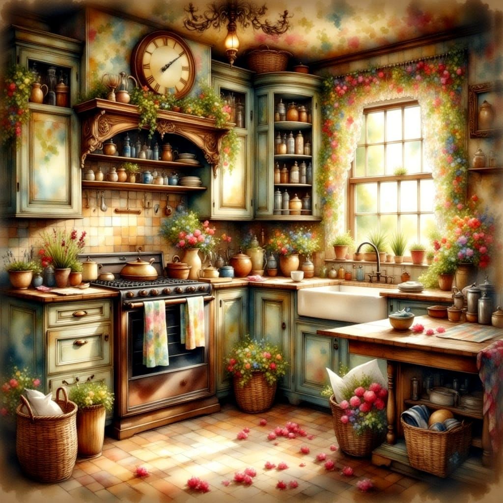 A watercolor painting of a sunny kitchen filled with love and warmth. This painterly image evokes a sense of nostalgia and cherished memories.