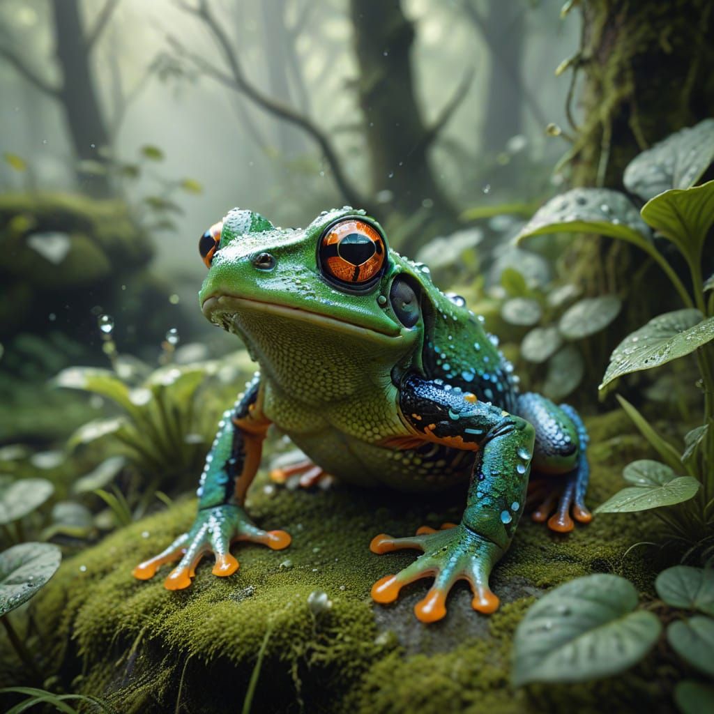 This image showcases a breathtakingly detailed close-up of a frog, set amidst a mystical, misty forest scene. The frog's vibrant turquoise-green skin and intricate details are rendered in photorealistic perfection, with delicate textures and subtle lighting effects creating an otherworldly atmosphere.