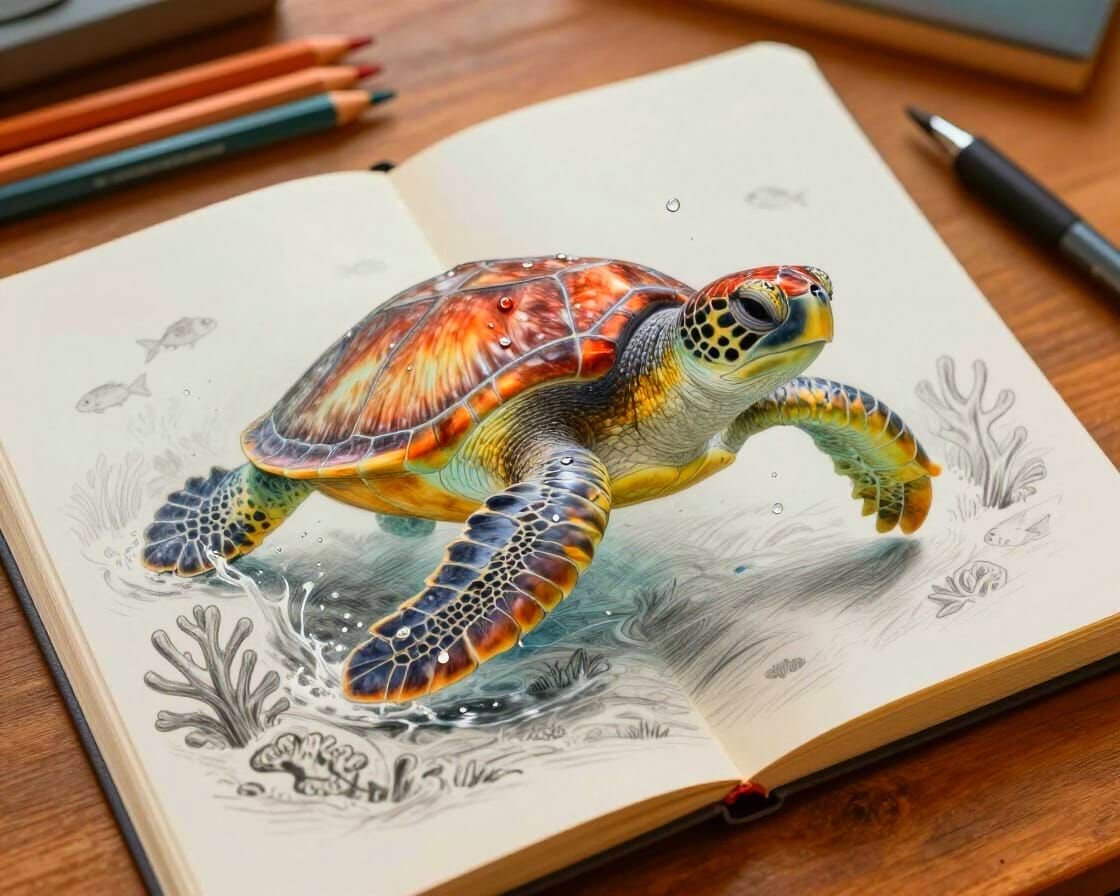 This image captures a sea turtle appearing to swim out of an open sketchbook on a wooden desk. It masterfully blends pencil drawing with luminous realism, creating a tranquil, mixed-media illusion.