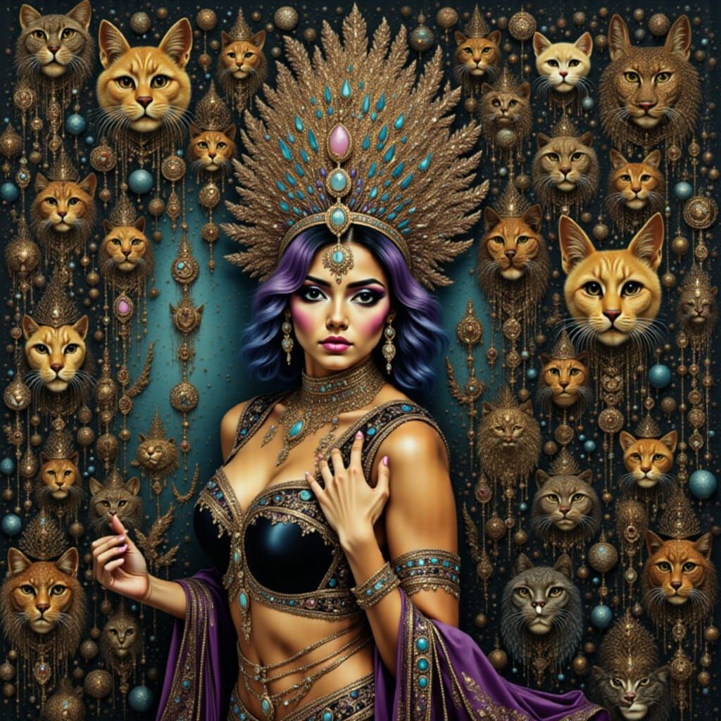 A striking image of a feline figure with colorful makeup. The art style features elements of fantasy and vibrant colors.