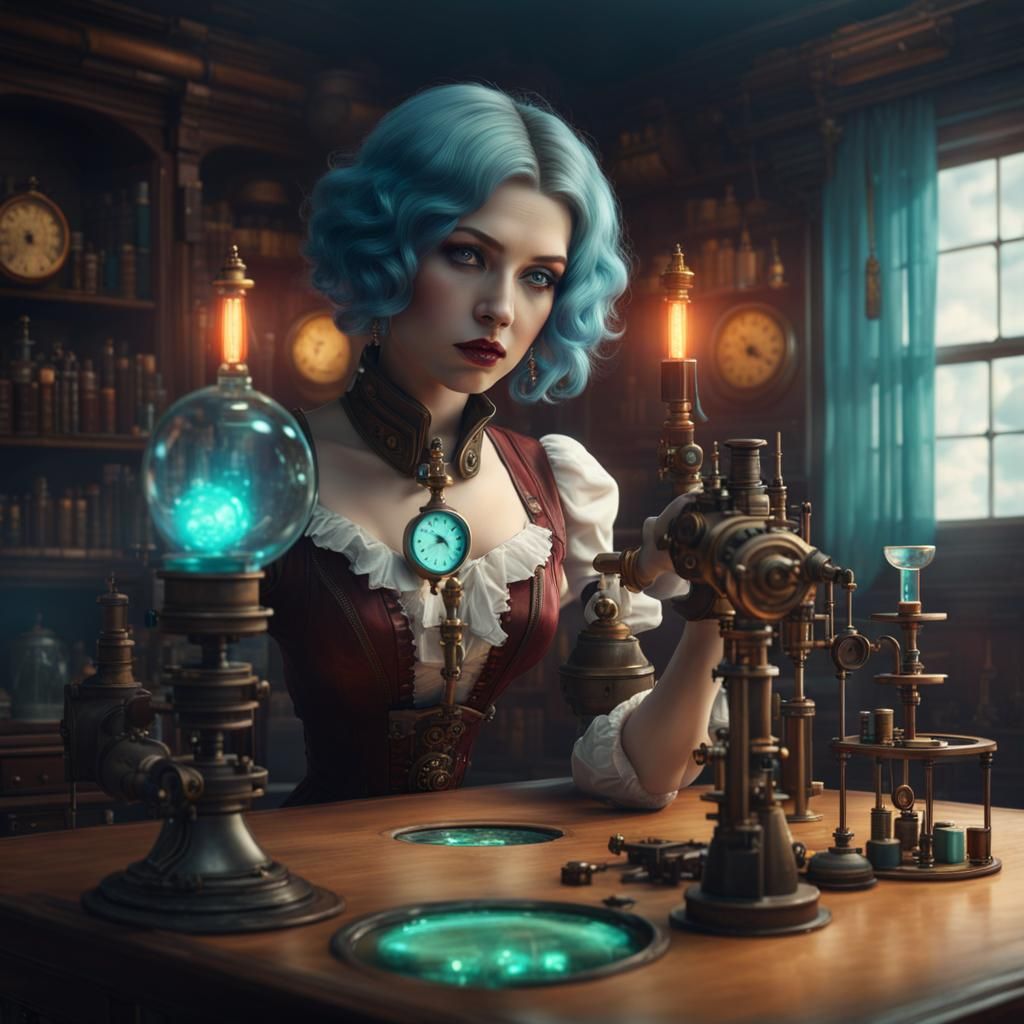 Behind a mahogany desk, a young laboratory woman assistant controls the quality of Sophium products.