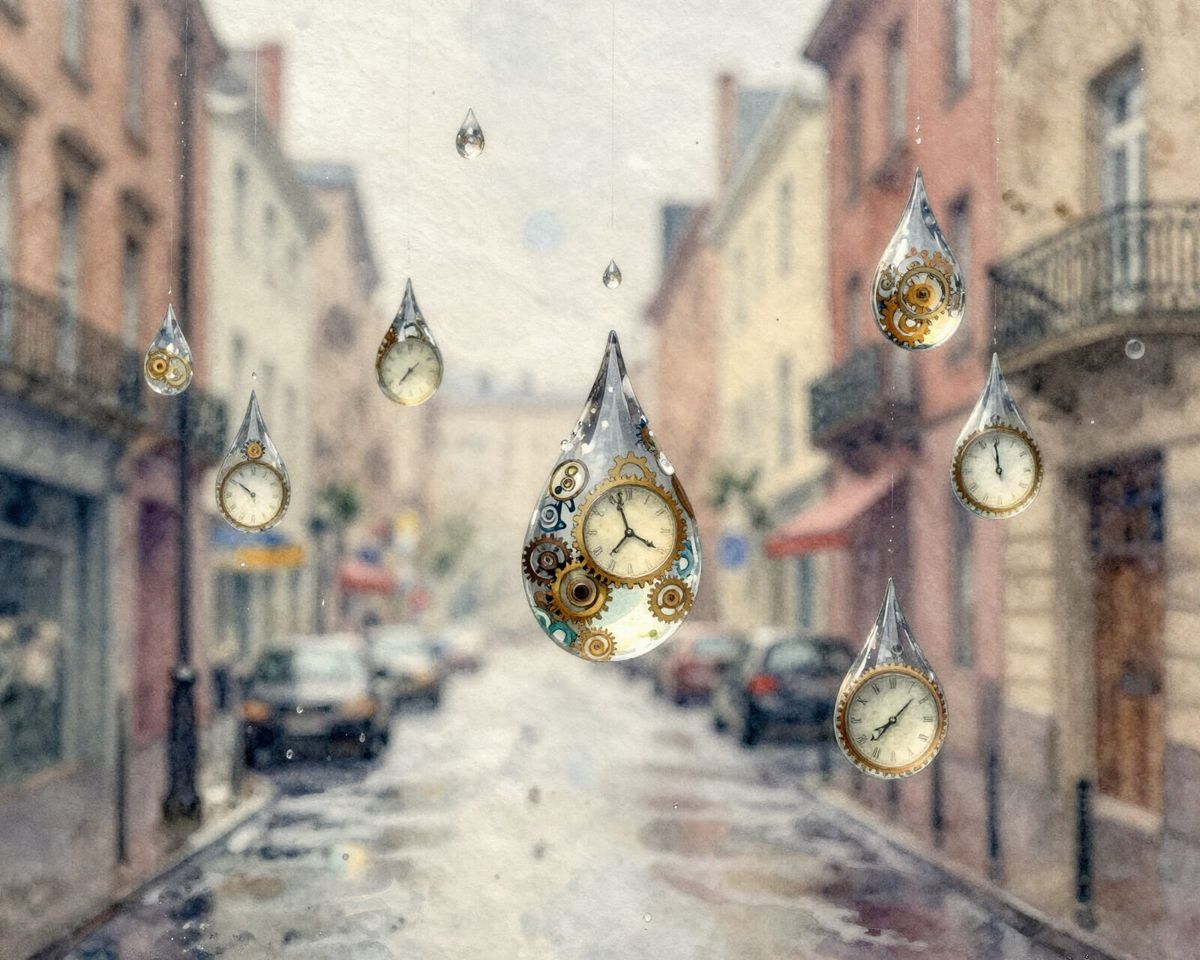 This image shows a surreal watercolor scene of rain falling on a city street. Each droplet contains tiny clock faces and gears, rendered with soft, fluid colors and intricate details.