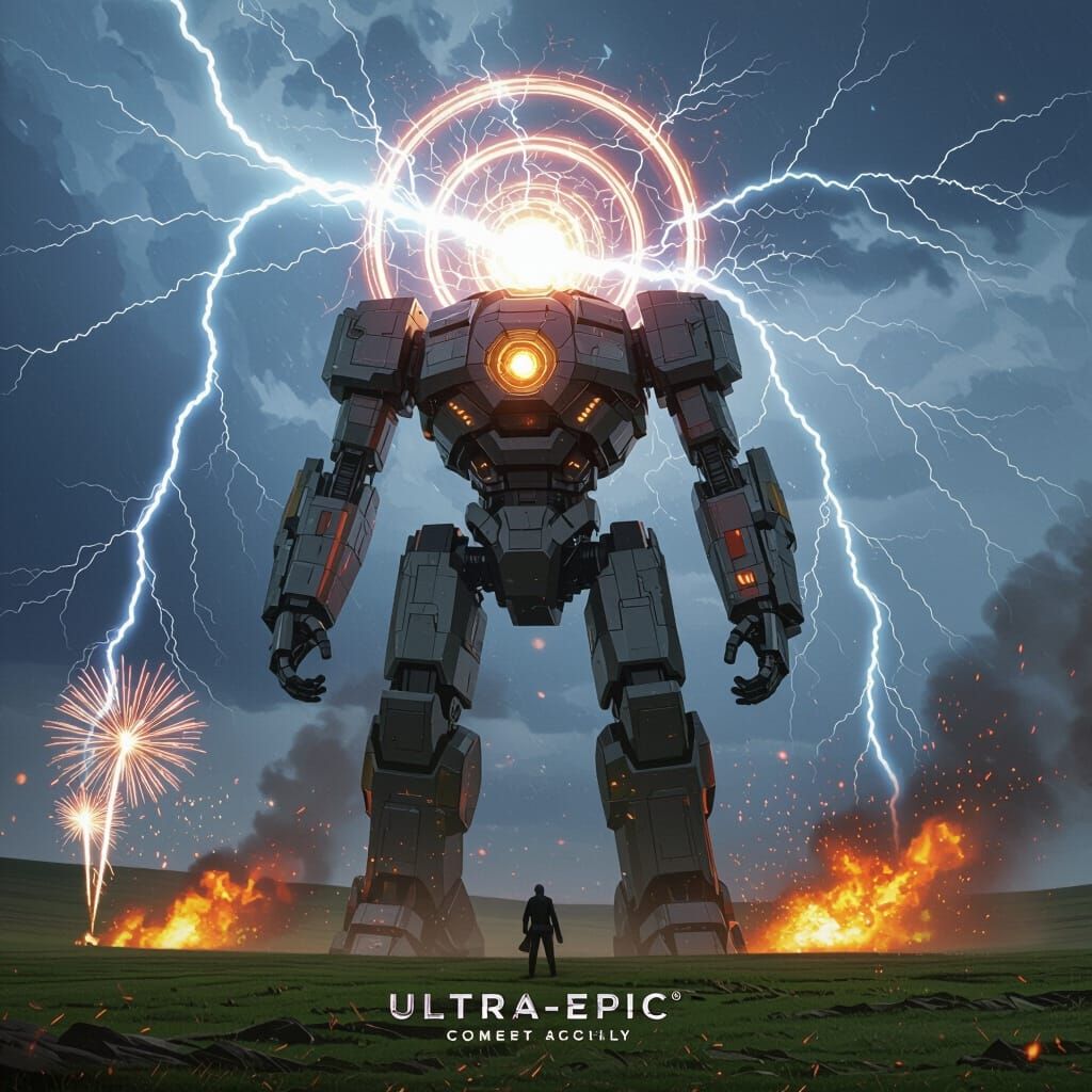 This image showcases a monumental, abstract robotic entity with geometric plates and glowing energy veins, set in a vast landscape during a chaotic storm with lightning and explosions.