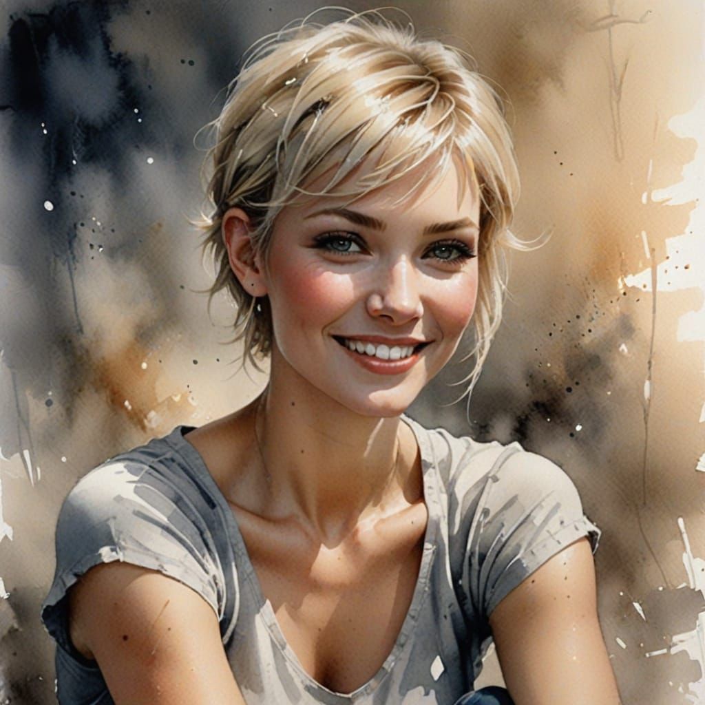 This image shows a watercolor portrait of a beautiful blonde girl with a pixie cut and grey eyes, sitting and smiling. The artwork employs sfumato techniques and a soft, muted color palette.