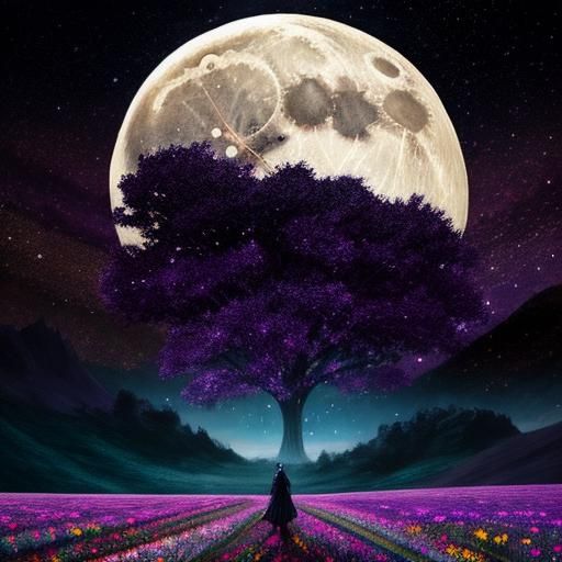 This image shows a girl gazing at a vibrant night sky filled with stars and a nebula. Warm light illuminates the flower field with distant mountains and trees, creating a dreamy, magical scene in an anime style.