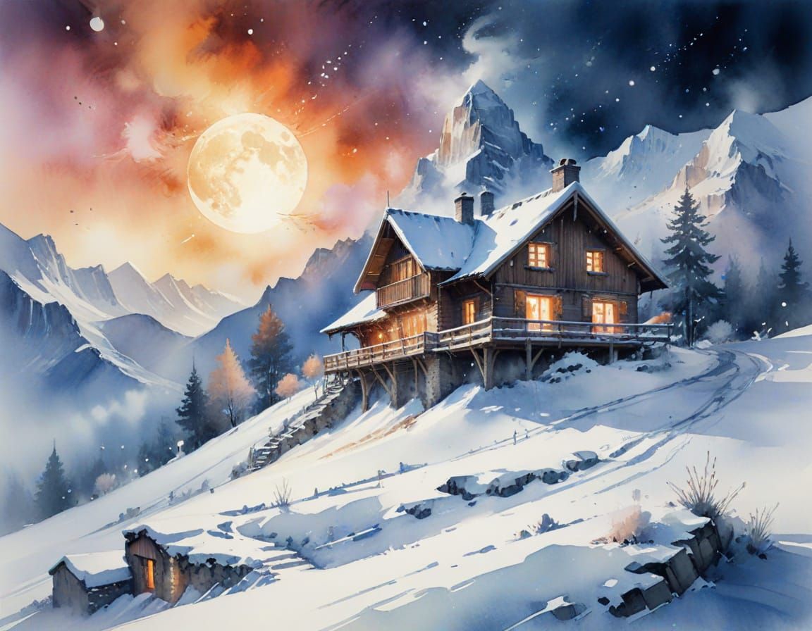 A watercolor painting of a quiet alpine village under a moonlit sky. Smoke rises from a chalet as stars twinkle in the night, in a painterly and stylized watercolor aesthetic.