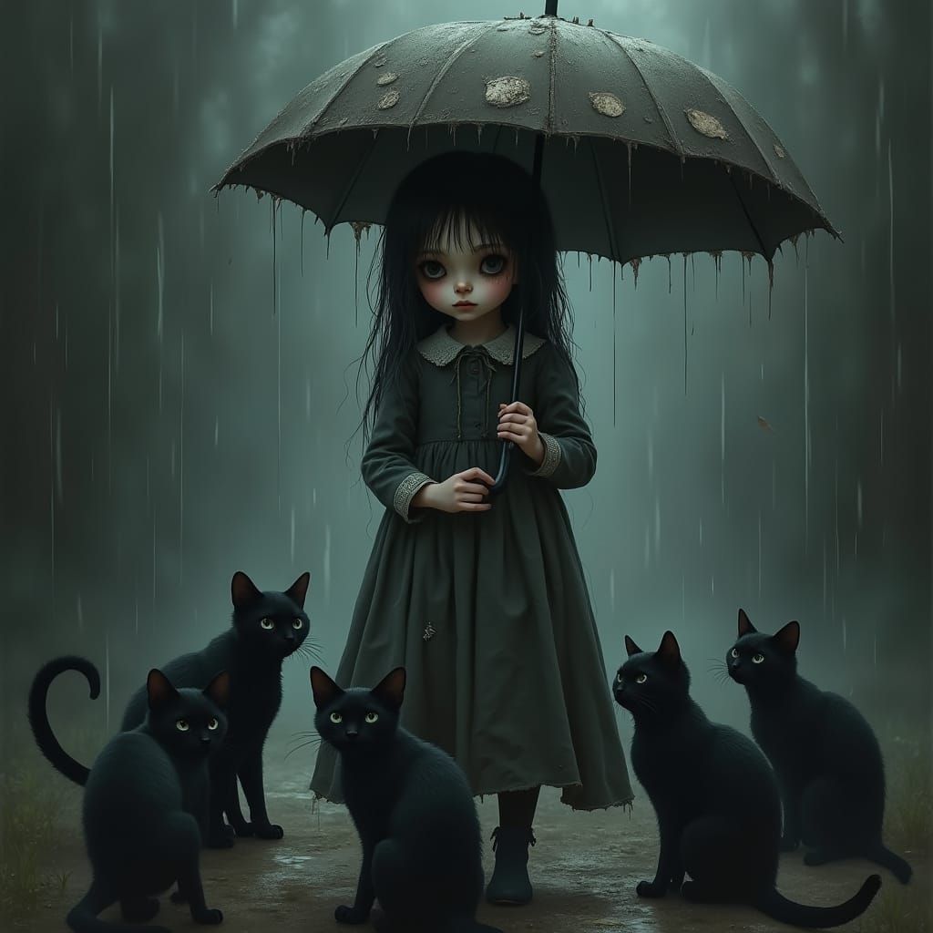 This image features an unsettlingly pale girl in a vintage dress, holding an umbrella amidst many black cats. The scene evokes a dark, rainy mood with high detail and realistic illustration.