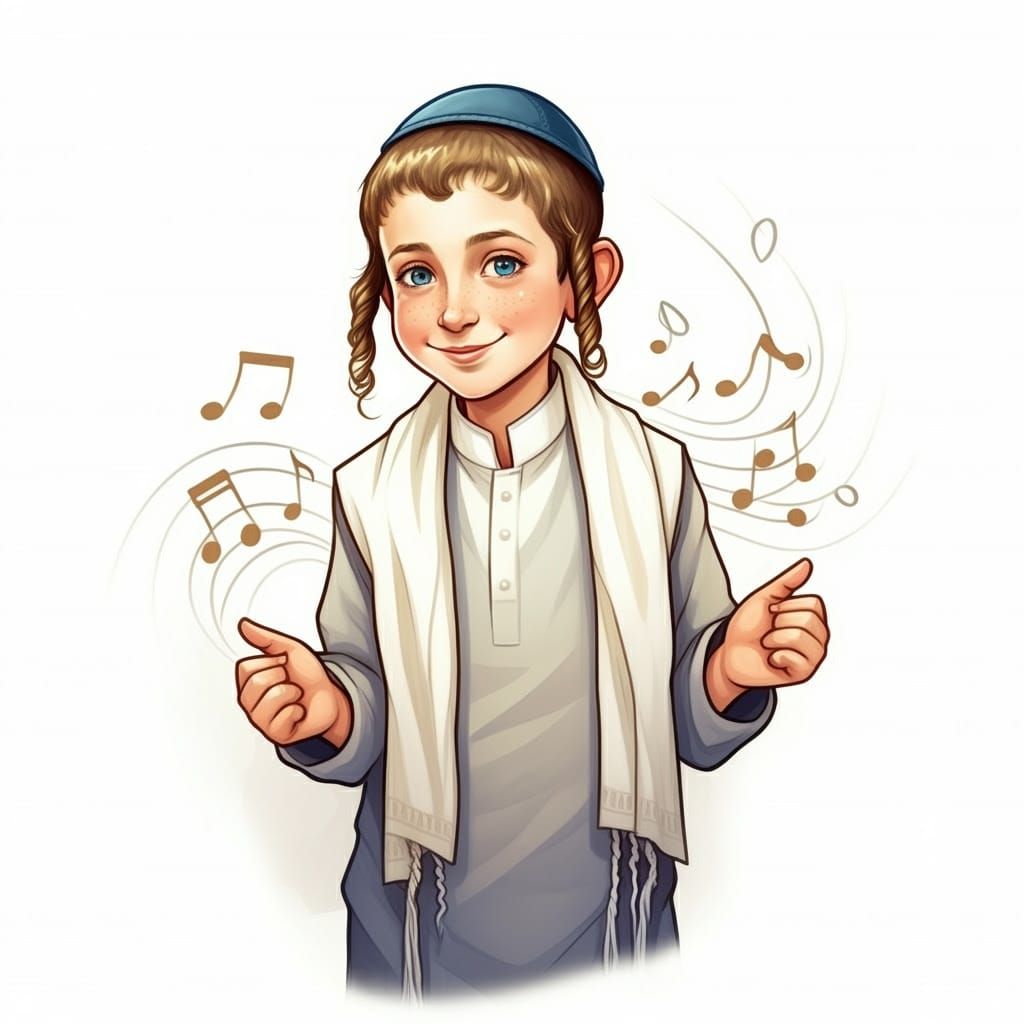 A charming Haredi Jewish boy, dressed in traditional attire, smiles as he dances, set against a simple white background with subtle musical notes