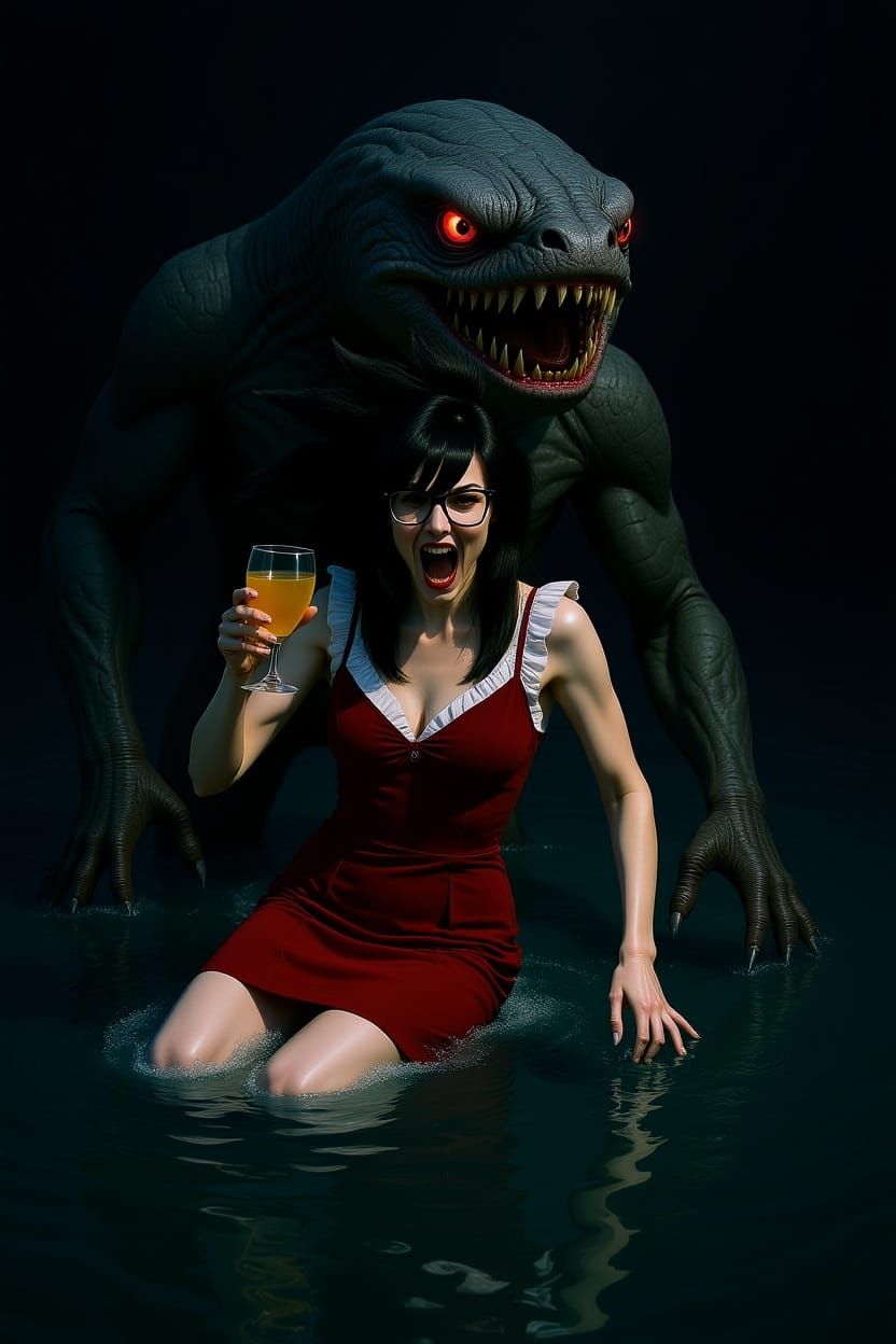 A realistic photo of a woman with red eyes witnessing a cosmic horror. A colossal moray eel towers over her as she floats toward a black hole singularity. This image captures a terrifying scene.