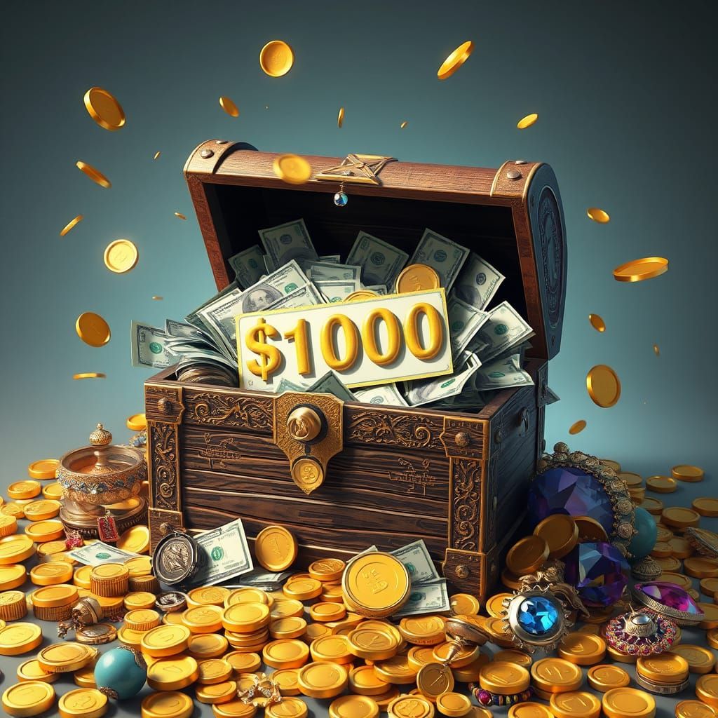 A treasure chest overflowing with cash, gold coins, jewels, and precious artifacts, rendered in a cyberpunk aesthetic with a blend of digital painting and 3D techniques.