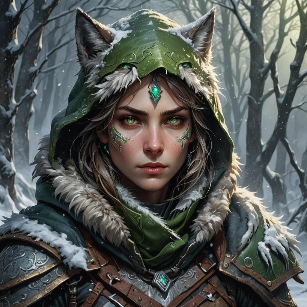 A striking picture of Vega, a lithe scout in a fur-lined hood, set against a backdrop of swirling icy mist. The portrait features deep, rich colors enhanced by volumetric lighting and intricate details.