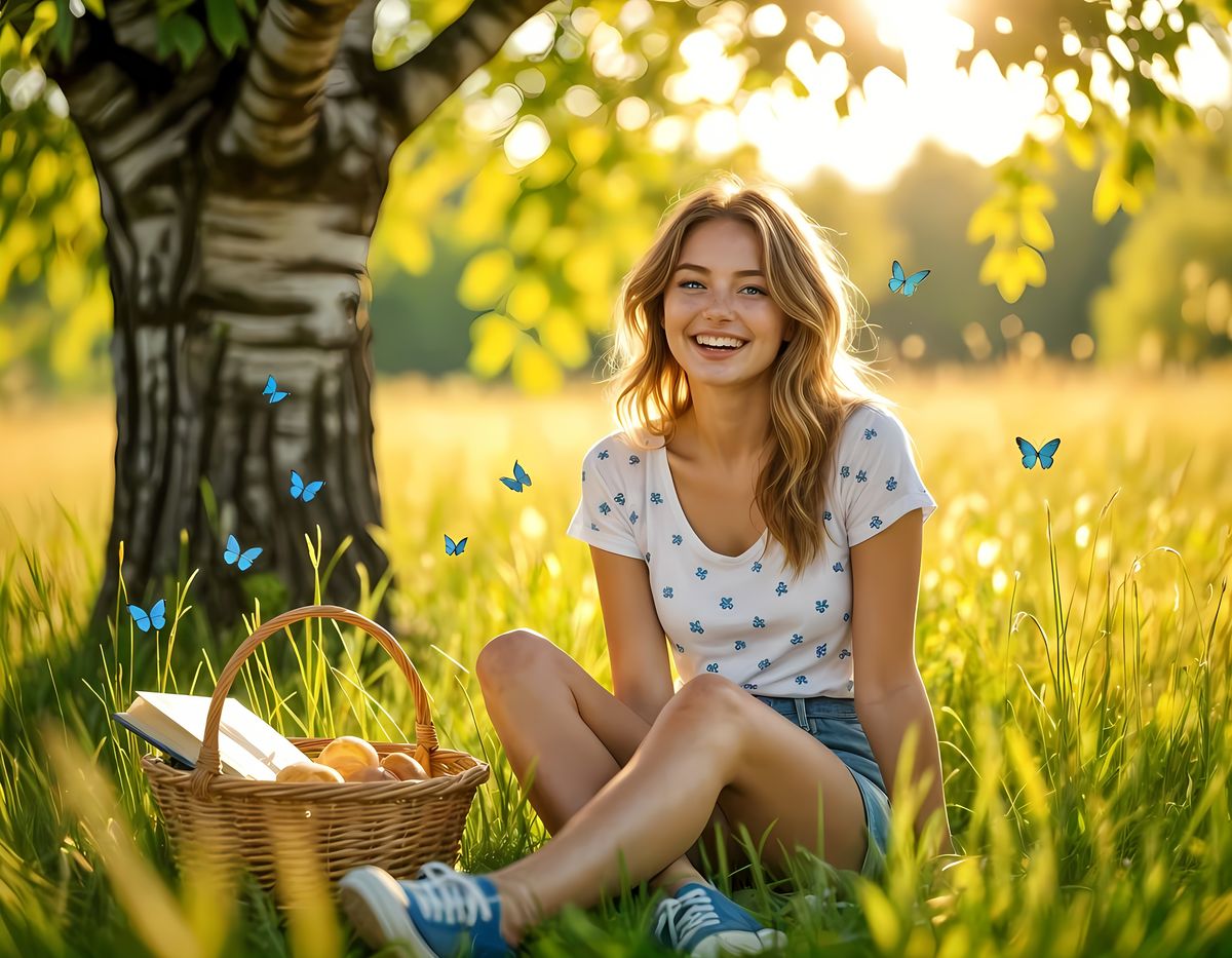 A cheerful young woman, with tousled light brown hair and freckles and dark blue eyes, sits laughing in the tall grass under a large birch tree. She wears a low-cut white T-shirt with small blue flowers, a short denim skirt, and blue sneakers. The sun filters through the leaves, casting moving shadows ...