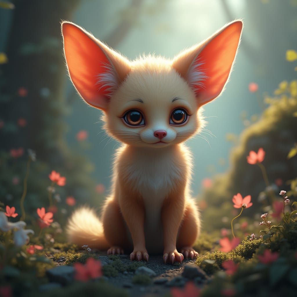 This image shows a hyperrealistic baby fennec fox with multicolored eyes in a dreamlike setting. The digital artwork features soft textures, rich colors and fantasy elements.