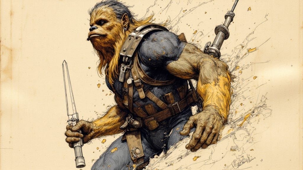 This dynamic action sketch features Chewbacca in a visceral comic book ink wash style with explosive color splatters and bold shading on aged paper.