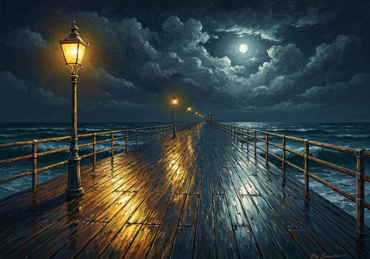 This image shows a wooden pier at night during a storm. An old streetlamp warmly lights the pier, surrounded by a choppy sea and dark, moonlit clouds in an impressionistic style.