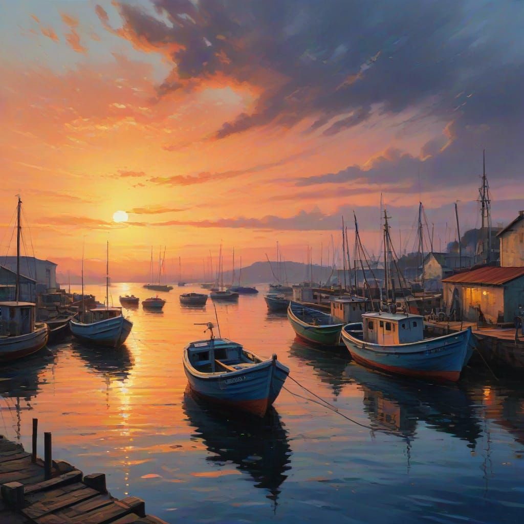 Easily generate your own vibrant coastal sunrise images, featuring busy harbors and fishing boats, for free!