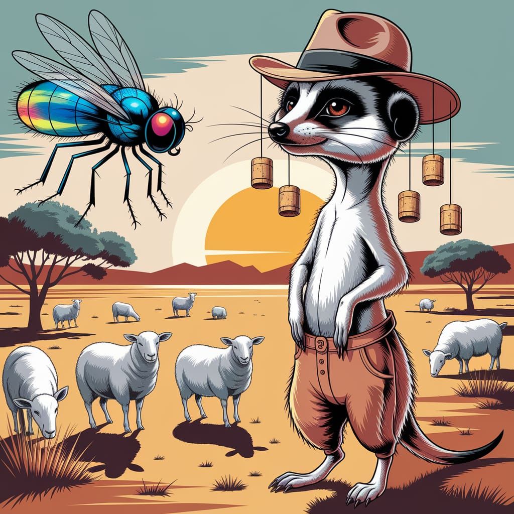 This image shows a meerkat in the Australian outback, depicted in a whimsical, early 20th-century illustration style. The meerkat wears breeches and a cork hat, while bluebottle flies buzz nearby.