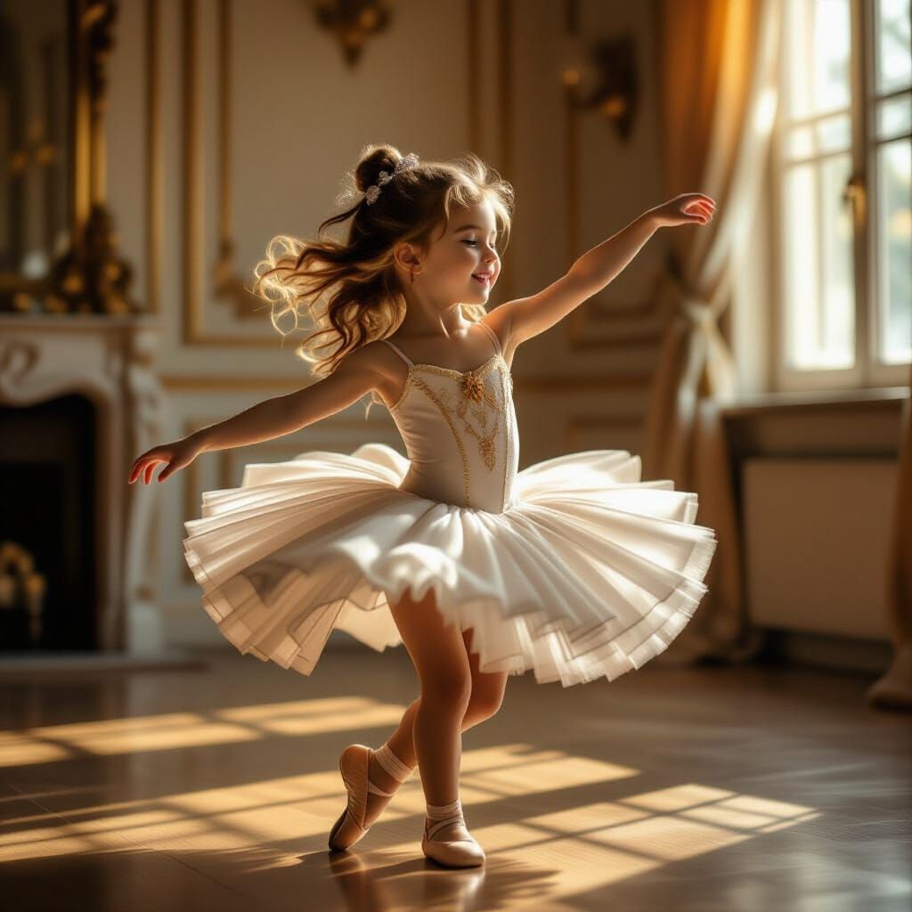 This image captures a young girl dancing joyfully in an ornate ballet dress, bathed in soft, golden cinematic light. It features vivid colors and dynamic lighting for breathtaking realism.